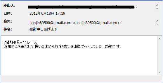 日曜から配信開始した4頭目の好調教馬を活用して、函館SSの3連単を的中されたようです。